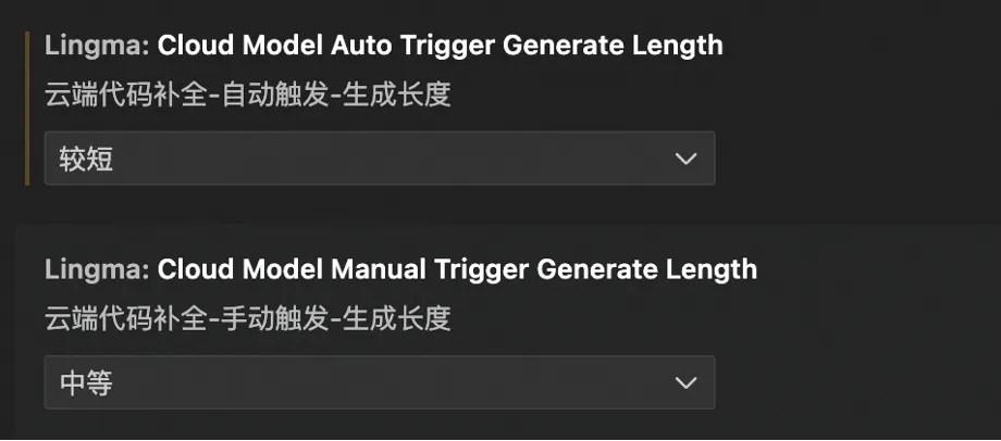 通义灵码支持将自动触发和手工触发的代码续写能力分别设置生成长度参数。通常建议将手工触发(默认快捷键 Alt+P) 设置得比自动触发稍长。