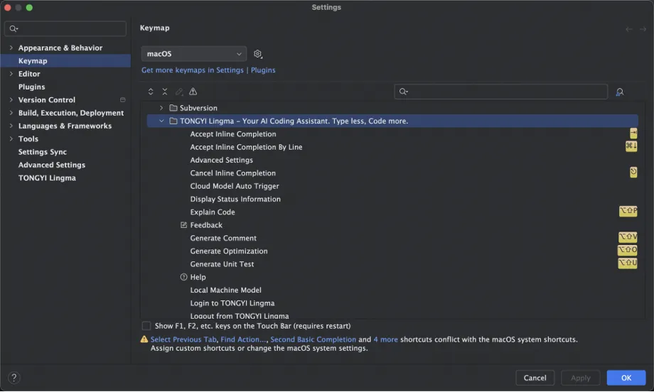 备注说明:为了便于识别,VSCode 的大部分通义灵码快捷键都是以 TONGYI Lingma 命名的,但触发内联建议、显示上一个/下一个内联建议快捷键复用了已经存在系统级功能项,因此命名风格上稍有差异。