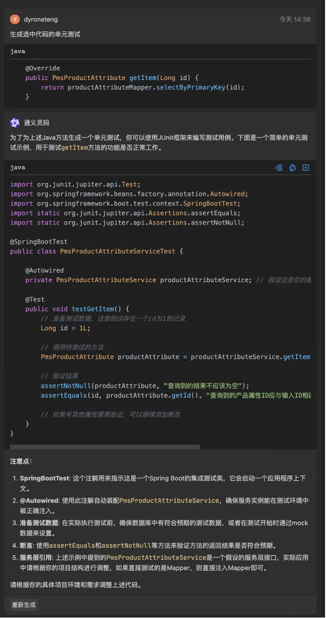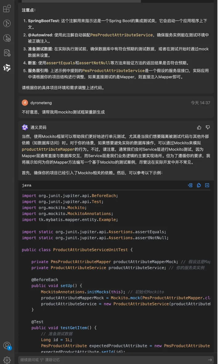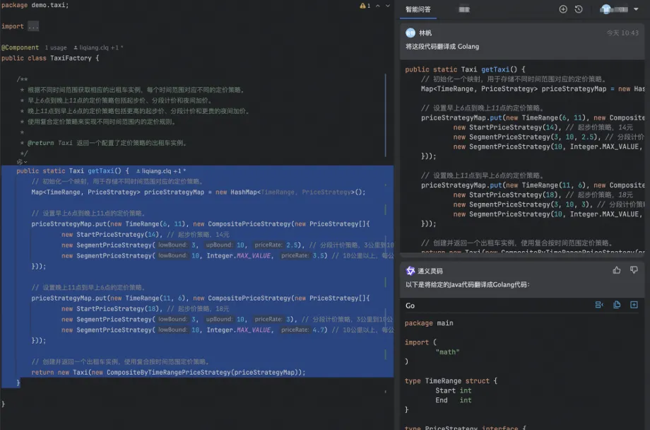 通过“编辑区的代码注释引导补全”或“使用通义灵码问答面板”都能实现基于注释生成整个方法的目的。由于通义灵码的智能问答场景,使用的模型参数会比代码补全模型的参数量更大,因此,对于这类场景,通常更推荐在问答面板里直接提出需要生成的问题描述。
