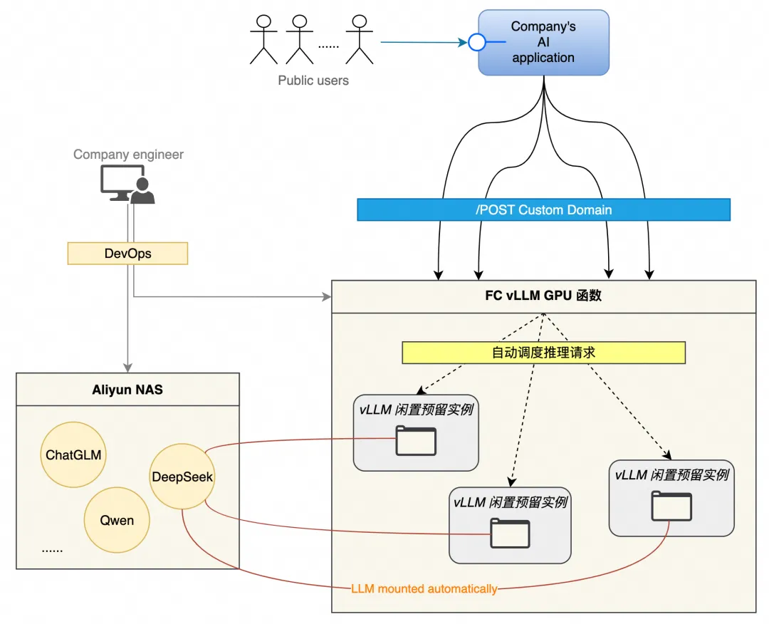 如果您希望进一步包装 vLLM,可以将自定义域名轻松嵌入到上层服务中并封装调用。企业无需关心底层 vLLM 实例的启动、调度、负载均衡以及亲和性等细节,FC 能够确保服务的高效与稳定运行。