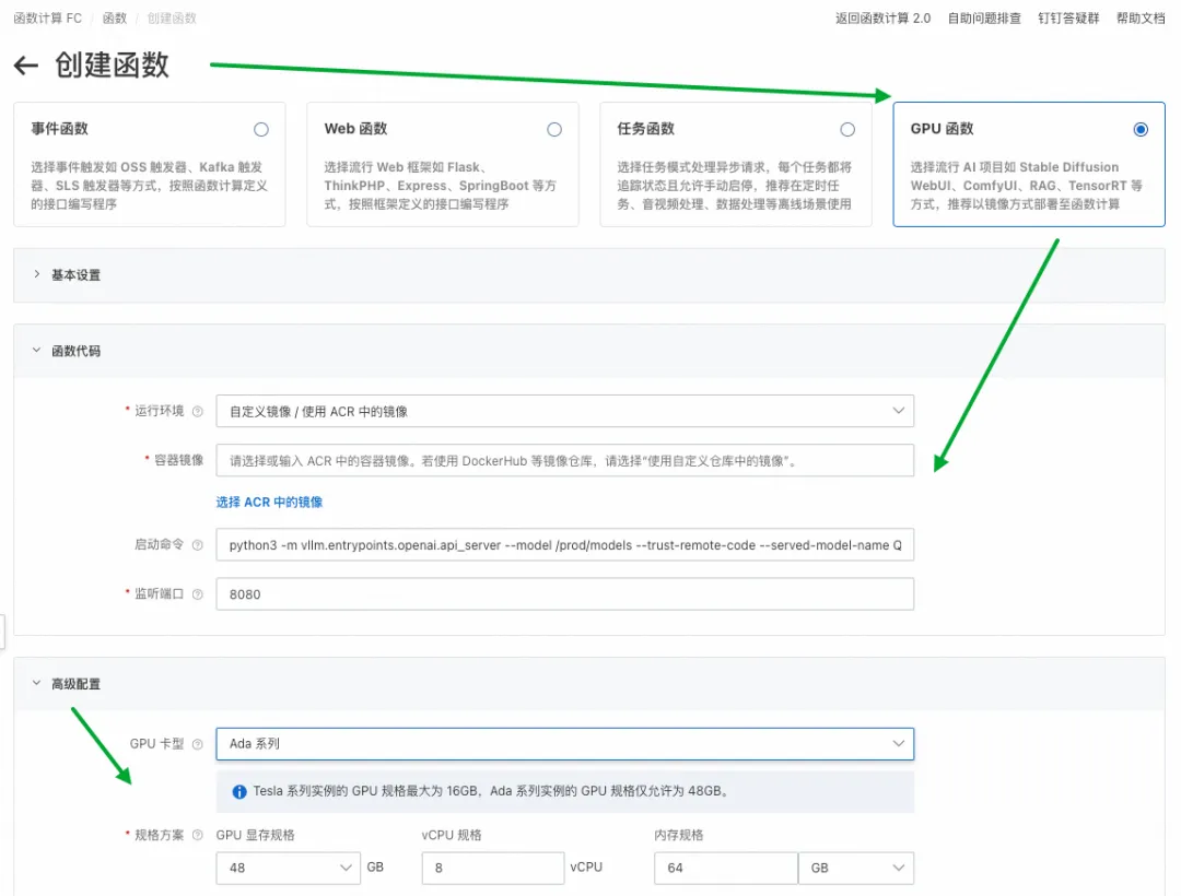 2. 创建函数:登录阿里云控制台,进入函数计算 3.0 管理页面,开始创建一个新的 GPU 函数,并选择适合的运行环境和配置。