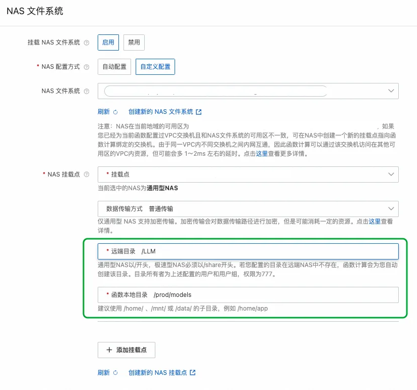 6. 指定模型挂载路径:为了实现模型的集中管理和更新,我们强烈建议用户将模型存储在 NAS 中。NAS 可以自动挂载到 FC 函数的 vLLM 服务实例中,从而实现模型的无缝集成。