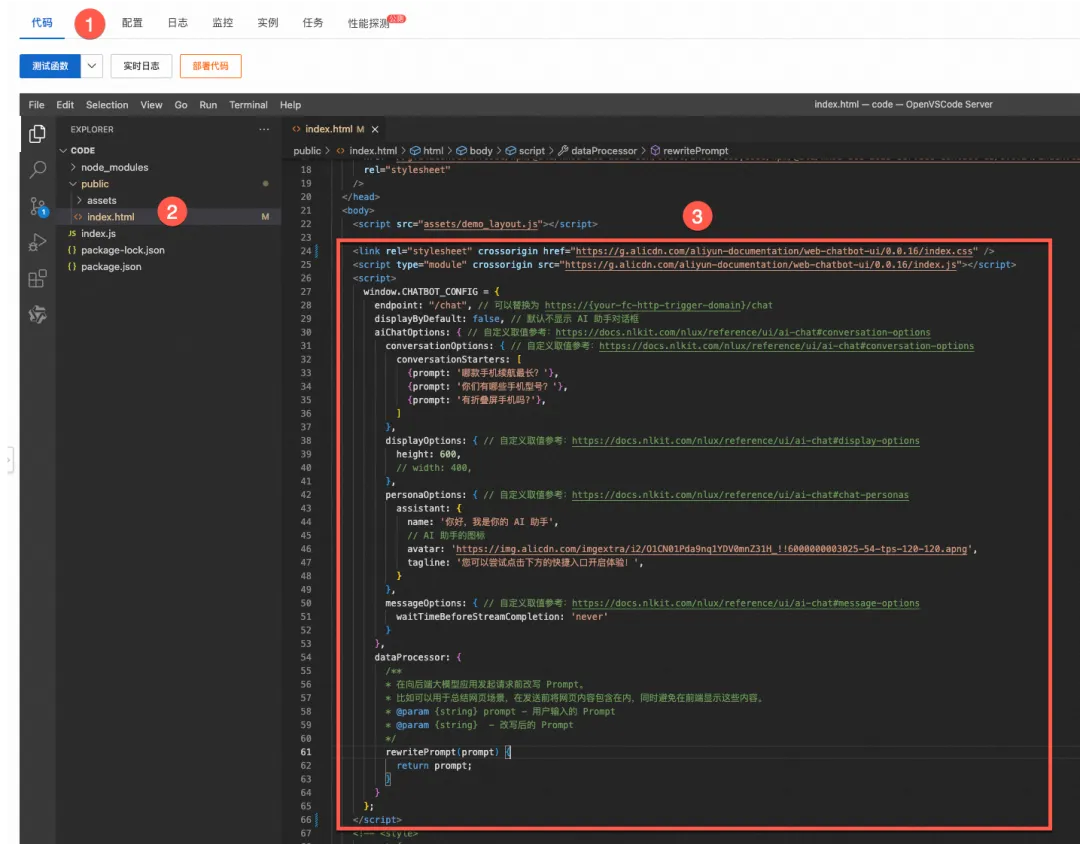 2. 进入函数详情页后,在代码视图中找到 public/index.html 文件,然后取消 ③ 所在位置的代码注释即可。