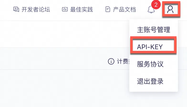 2. 在顶部导航栏右侧,点击人型图标,点击 API-KEY 进入我的 API-KEY 页面。在页面右侧,点击创建我的 API-KEY,在弹出窗口中创建一个新 API-KEY。保存 API-KEY 到本地用于后续配置。
