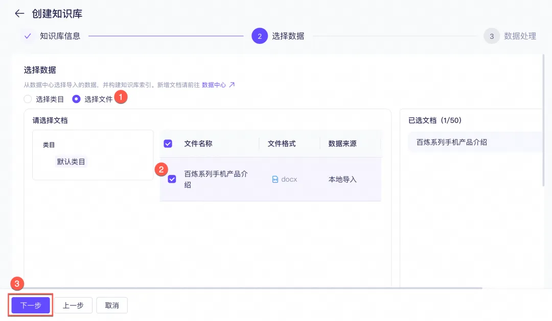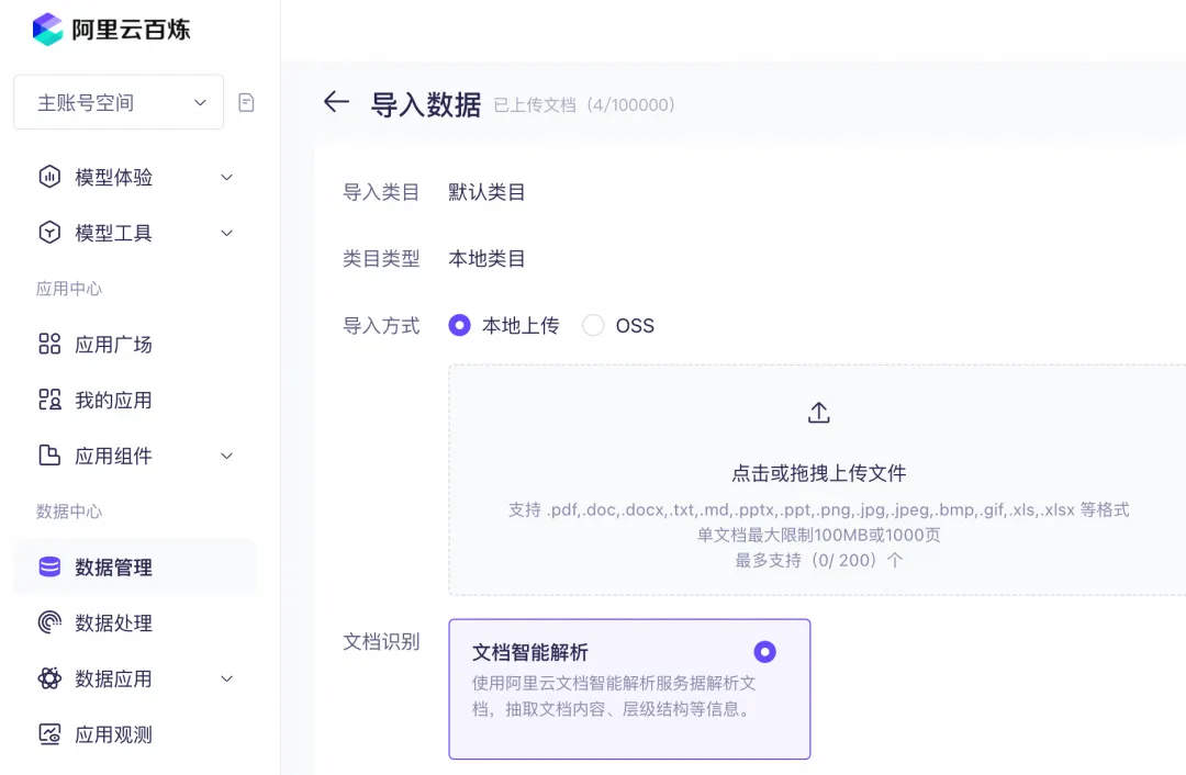 1. 上传文件:在百炼控制台的数据管理中的非结构化数据页签中点击导入数据,根据引导上传我们虚构的百炼系列手机产品介绍:
