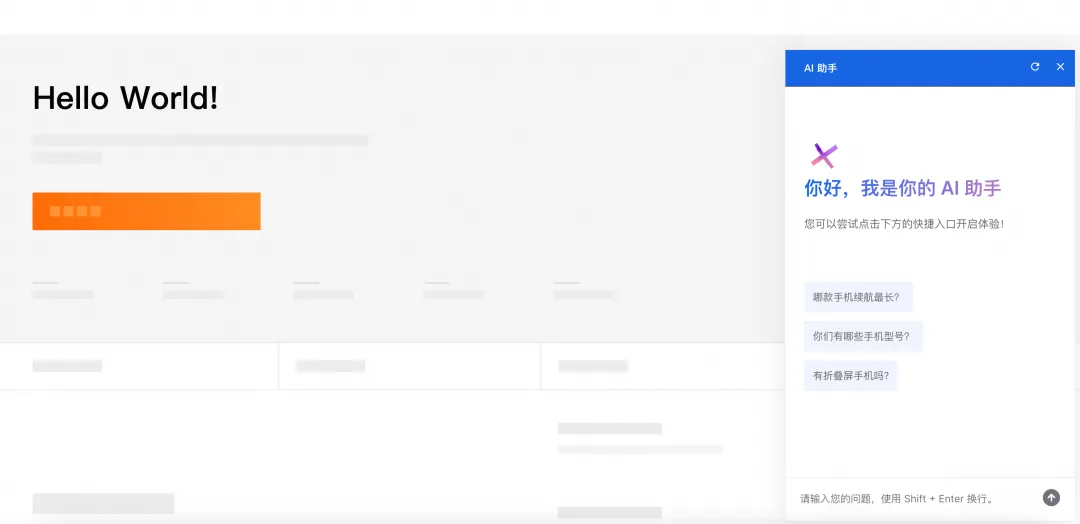 3. 最后点击部署代码,等待部署完成即可。3.2 验证网站上的 AI 助手现在,您可以重新访问示例网站页面以查看最新效果。此时您会发现网站的右下角出现了 AI 助手图标 ,点击即可唤起 AI 助手。本方案提供的网站为示例网站,网站本身细节内容仅展示样式,效果如下图。