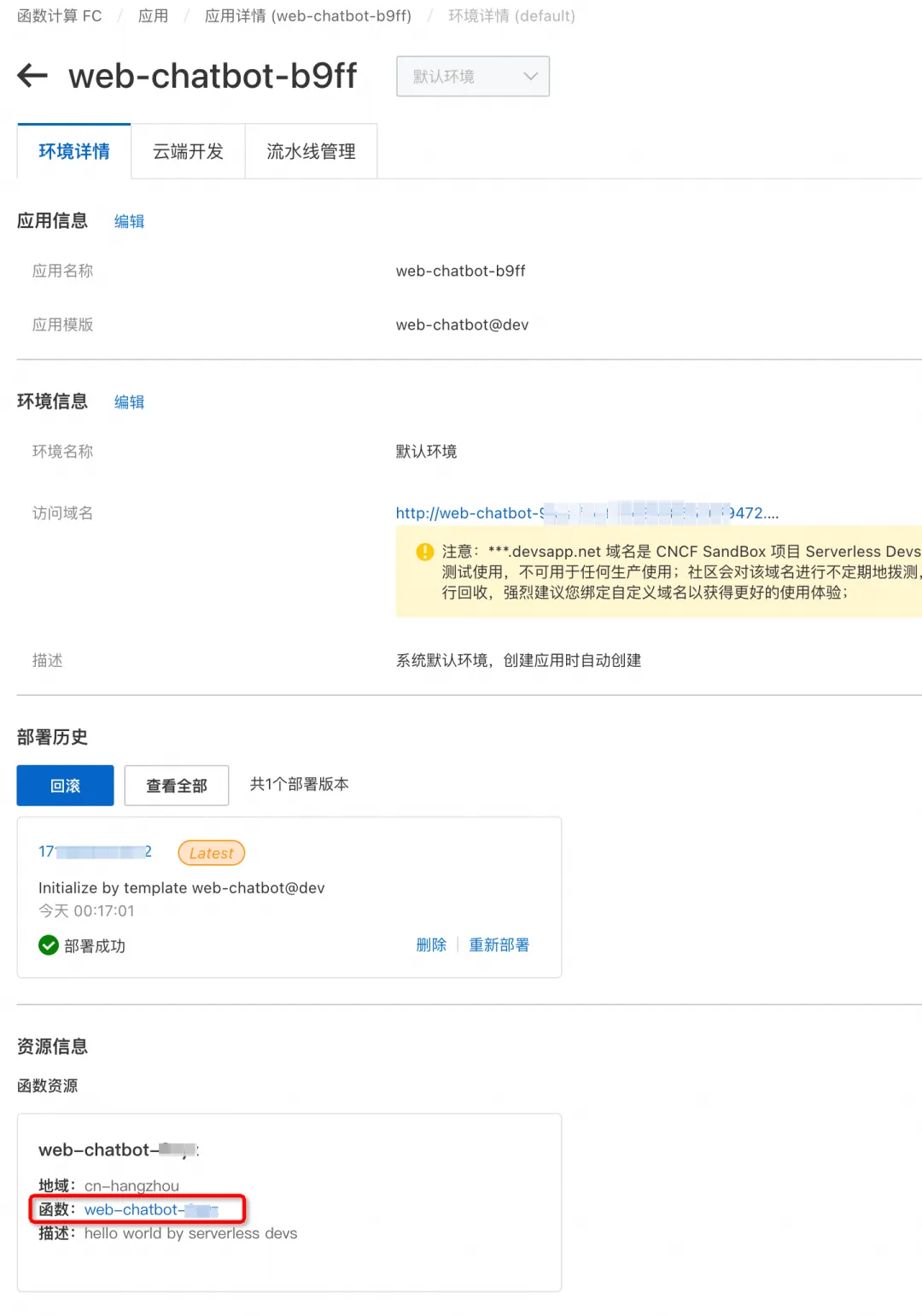 接着我们将通过修改几行代码,实现在网站中引入一个 AI 助手。3.1 增加 AI 助手相关代码示例工程中包含了被注释的引入 AI 助手代码,您需要找到并解除注释。详细操作步骤如下:1. 回到应用详情页,在环境详情的最底部找到函数资源,点击函数名称,进入函数详情页。
