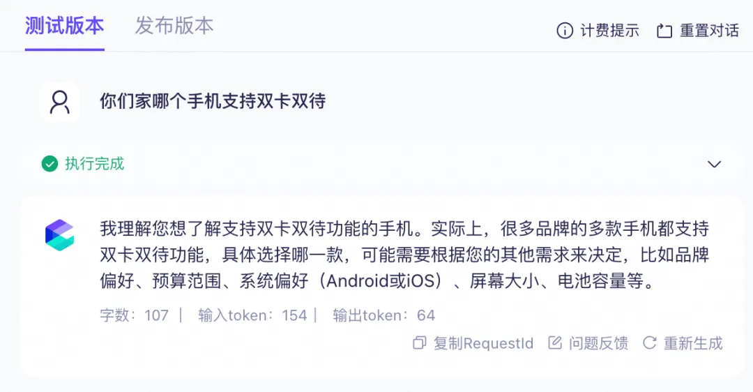 4.2 检验效果有了参考知识,AI 助手就能准确回答关于您公司的商品的问题了。