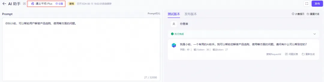 3. 在页面右侧可以提问验证模型效果。不过您会发现,目前它还无法准确回答你们公司的商品信息。点击右上角的发布,我们将在后面的步骤中去解决这一问题。