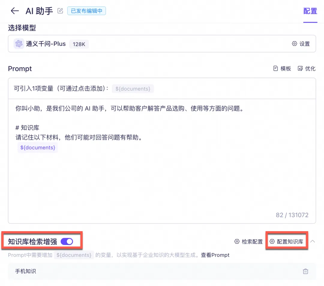 3. 引用知识:完成知识库的创建后,可以返回我的应用进入到刚才创建的应用设置界面,打开知识检索增强开关、选择目标知识库,测试验证符合预期后点击发布。Prompt 中会被自动添加一段信息,以便大模型在后续回答时参考检索出来的信息。
