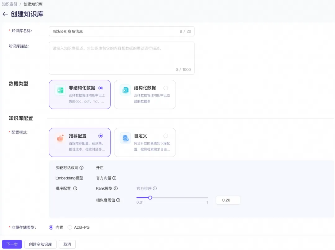 选择向量存储类型时,如果您希望集中存储、灵活管理多个应用的向量数据,可选择 ADB-PG。