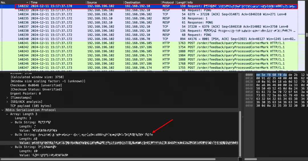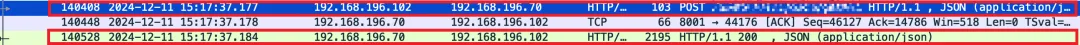 如上报文为在 Gateway pod 中抓取的 Gateway(192.168.196.102)访问后端应用(192.168.196.70)的报文(根据 token 过滤,确保与上述请求在业务上为同一条请求),在 15:17:37(后续简称37秒)Gateway 向后端应用发起请求(序号140408报文),在 15:17:37(后续简称37秒)Gateway 收到了后端应用的响应(序号140528报文)。