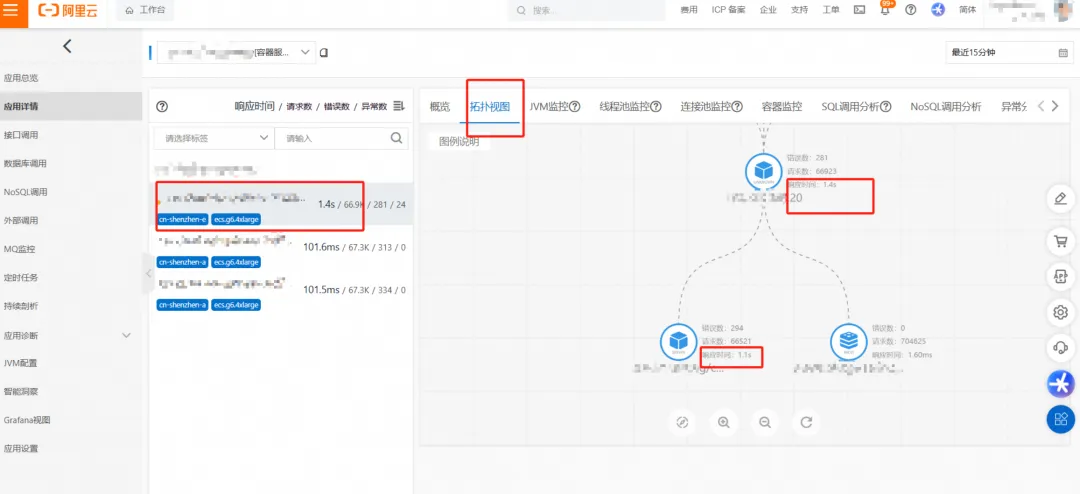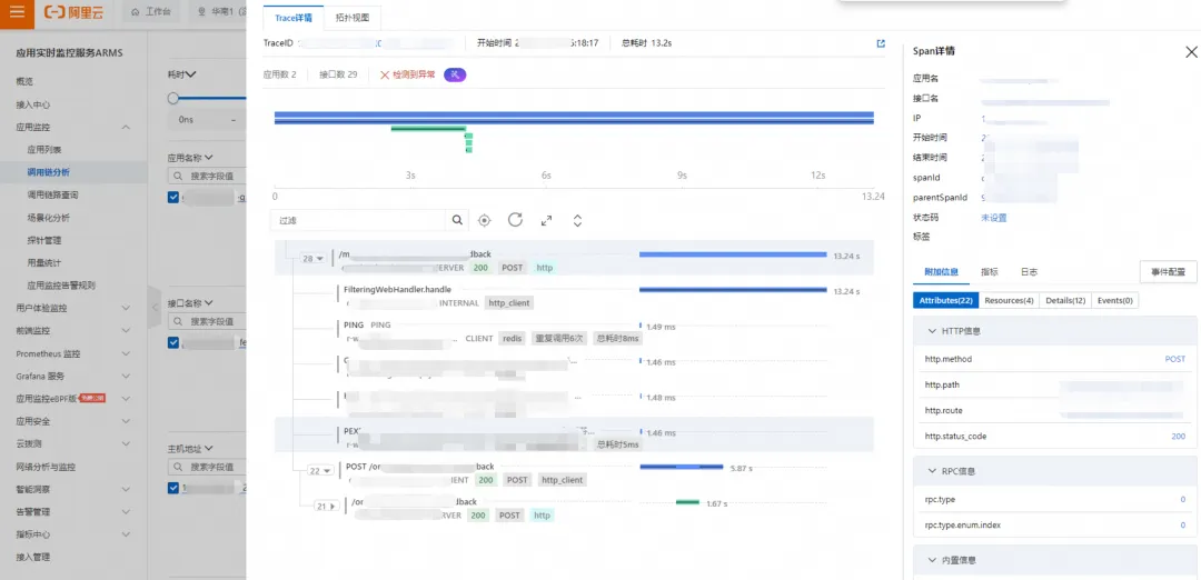 基于上述信息,无法直接判断出具体的耗时点在哪?好在工程师发现,系统应用均接入到了阿里云 ARMS 中,想到可以通过查看调用链进一步判断耗时点。