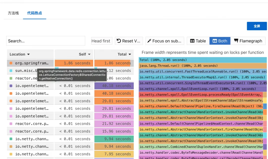 再次查看耗时高接口的代码热点,发现耗时主要集中在 LettuceConnectionFactory.validateConnection() 方法上。同时通过在压测期间,获取问题现场的 jstack,可以发现有大量的 Reactor 线程阻塞在了同一个 monitor 上。