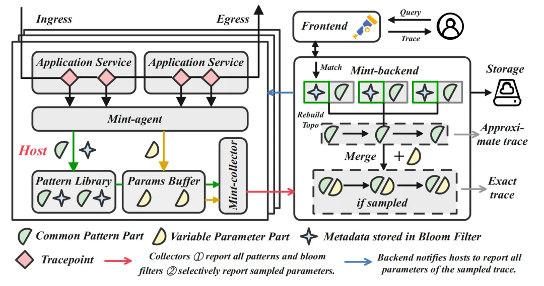 在入选顶会ASPLOS的论文《Mint: Cost-Efficient Tracing with All Requests Collection via Commonality and Variability Analysis》中,阿里云提出了一套全新链路追踪框架Mint,该框架通过“共性+差异”的新采样范式,既能保留重要信息,又能减少数据体量,实现了优化存储与网络开销的同时,捕获所有请求的调用链信息,让开发者可以借助丰富的数据更好的理解与管理复杂的应用系统。该论文是阿里云在可观测链路追踪(Tracing)领域入选的首篇顶会文章。