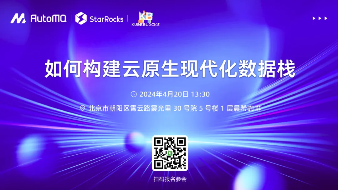 4 月 20 日,AutoMQ 联合 StarRocks 和 KubeBlocks 将在北京举办《企业如何构建云原生现代化数据栈》Meetup。会议将探讨云原生现代化数据栈在不同场景下的实际应用案例。其中,京东 Kafka 云原生架构师钟厚会分享 AutoMQ 部署在 Kubernetes 上的经验,同时,AutoMQ 首席产品经理陈仲良为大家介绍 AutoMQ 的弹性能力和适用场景。