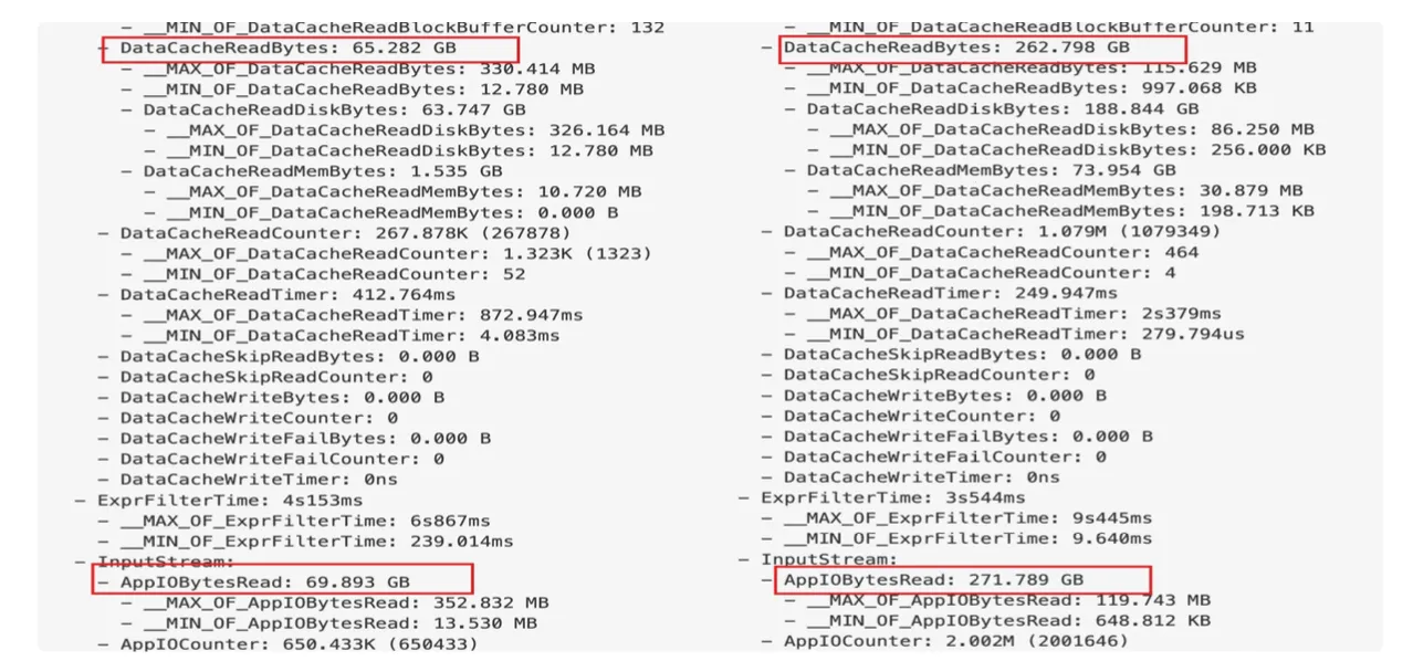 此外,通过优化存储方式,尤其是应用Iceberg的Parquet存储格式(如版本1.12),我们在存储效率上也获得了显著的提升。与原有的ClickHouse存量分离版本相比,采用Iceberg存储后,尽管数据量和行数保持一致, 但实际存储空间减少了一半 。