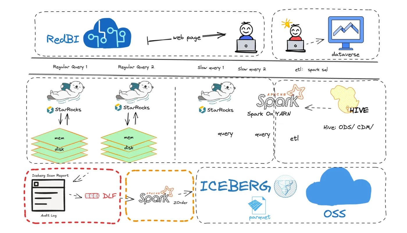 - 数据湖管理平台 (DLF): 通过分析审计日志,智能推断出自助分析数据集中的表的候选排序列。根据这些列的NDV(不同值数量)做一层筛选,最终系统会自动在 Dataverse 平台创建和更新rewrite_zorder_dataFiles 任务。