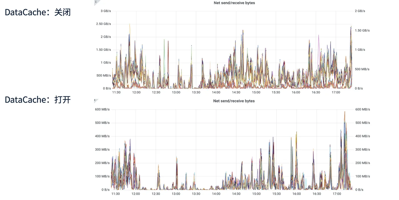 通过对比开启和关闭DataCache时的监控数据,我们可以在Grafana中清晰地看到,开启DataCache后,网卡流量显著降低,节省的带宽几乎达到了2到3倍。