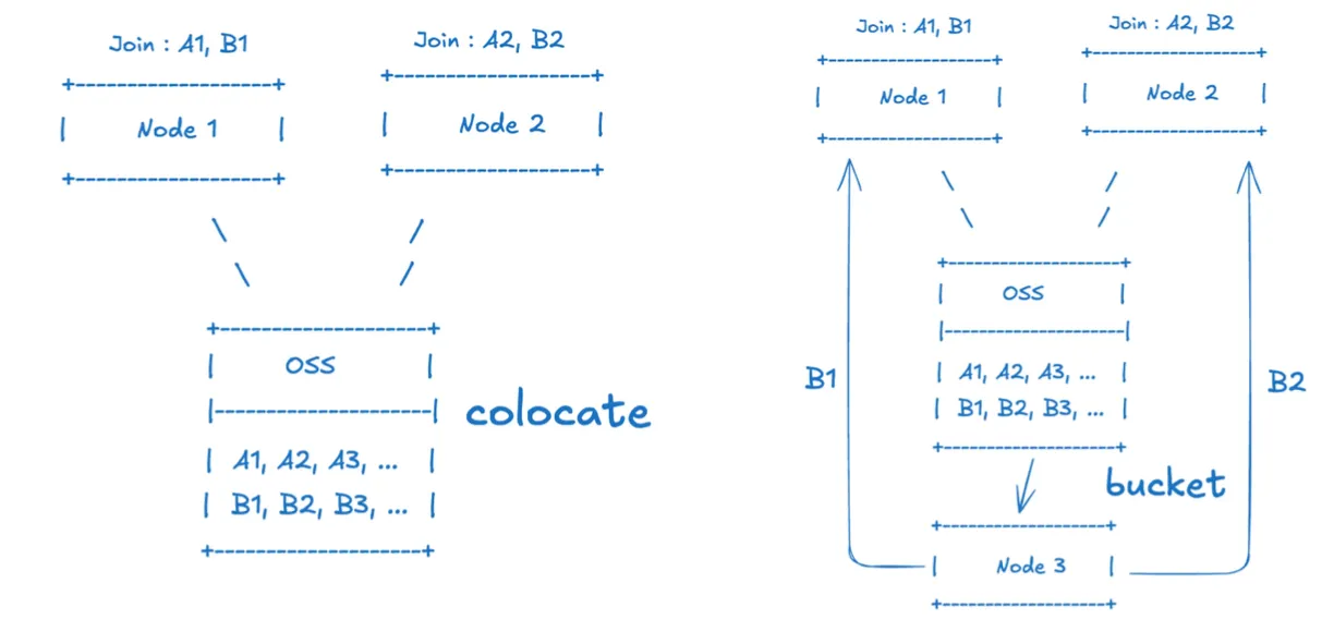 为解决这一问题,我们首先针对规模较大的多表数据集,选择采用 Iceberg 分桶表(10 桶) 的方式优化数据分布。同时,在 StarRocks 中引入对 Iceberg 分桶表的 Colocate Join 和 Bucket Join 支持,减少 Shuffle Join 对网卡带宽的依赖,从而缓解性能压力。在这一阶段,我们优先缓解网卡带宽瓶颈,待机型满足要求后,再逐步引入 DataCache ,通过本地磁盘读取替代从 OSS 读取数据的方式。