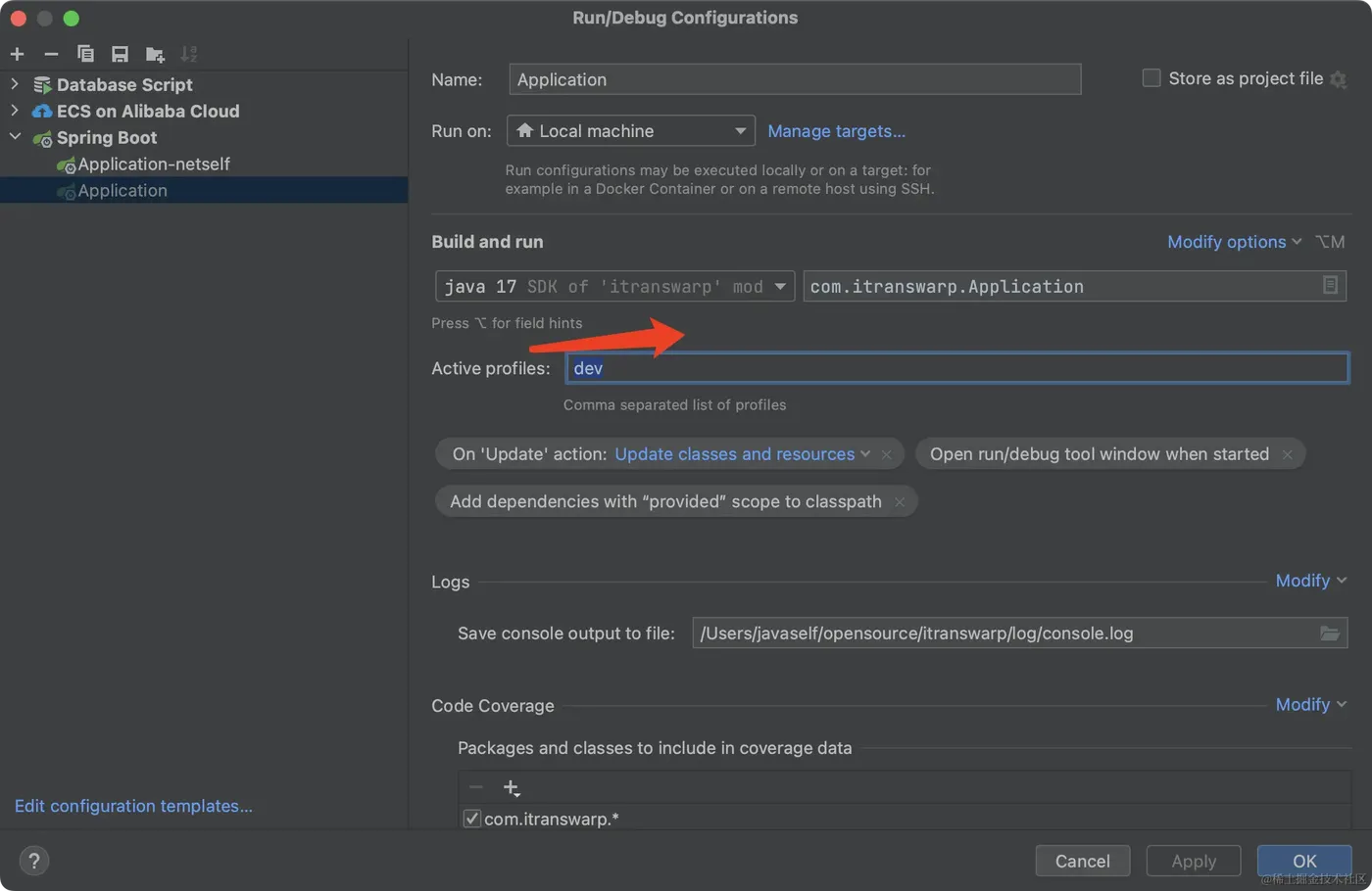 找到profile配置项(profile就是环境的意思),值为dev。因为idea是开发环境嘛,所以直接填写dev即可。