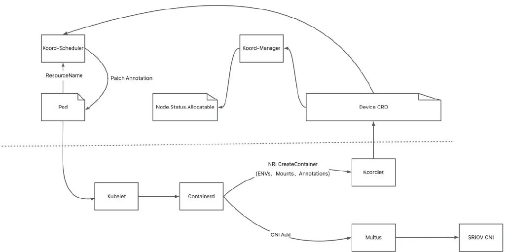 4. Multus-CNI访问Koordlet PodResources Proxy以获取分配给Pods的RDMA设备,并将相应的NIC附加到Pods的网络命名空间中。