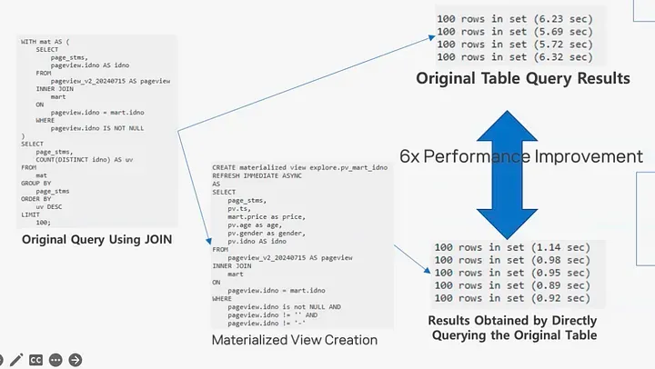 对于上述查询,我们创建了一个反范式化的物化视图来绕过 JOIN 操作,从而实现了 6 倍的性能提升。尤为值得一提的是,这些物化视图可以按需添加,且得益于 StarRocks 的查询重写功能,我们无需修改原始 SQL。这种灵活性使我们能够随时优化查询性能,同时保持工作流的简洁性。