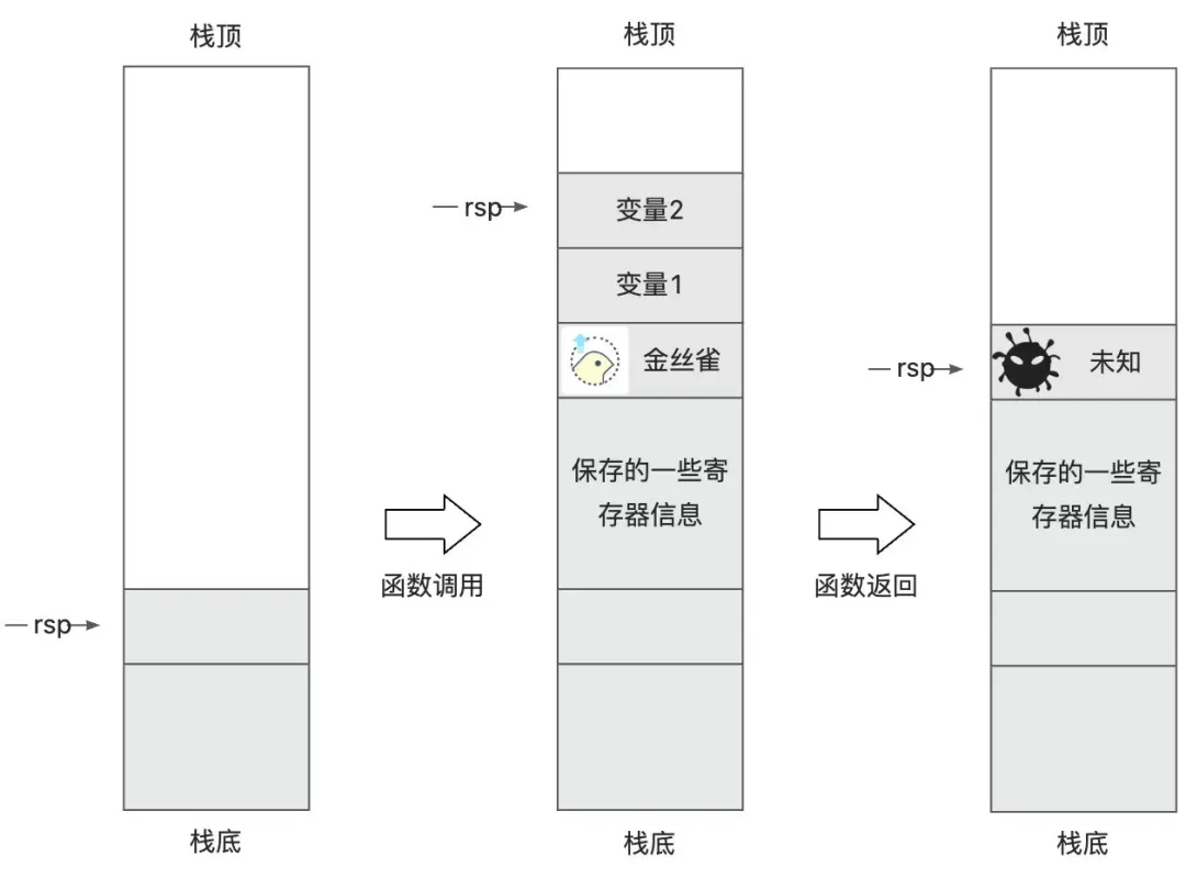 可以看到因为发生 __stack_chk_fail,导致机器发生 panic 挂掉,那接着分析一下为什么会发生 __stack_chk_fail。__stack_chk_fail 这里就是开启 stack protector 后,程序在执行函数最开始会在 rsp 向栈顶偏移一定位置的地址放置一个金丝雀(canary),执行完成后查看金丝雀有没有被恶意修改。下图简要展示了安放金丝雀后开始执行函数的栈变化,当函数执行完后,会重新判断金丝雀的值是否跟之前一致,一致的情况下才认为能够安全返回,否则说明栈上信息被恶意修改,最坏的情况是跳到其它函数(跟注入一个新的函数有点儿类似)特别是病毒程序继续运行,但“道高一尺,魔高一丈”,金丝雀能防护的只是按照从栈顶开始顺序破坏栈上数据的情况。对于绕过金丝雀直接修改栈中间数据的情况,就无能为力了。