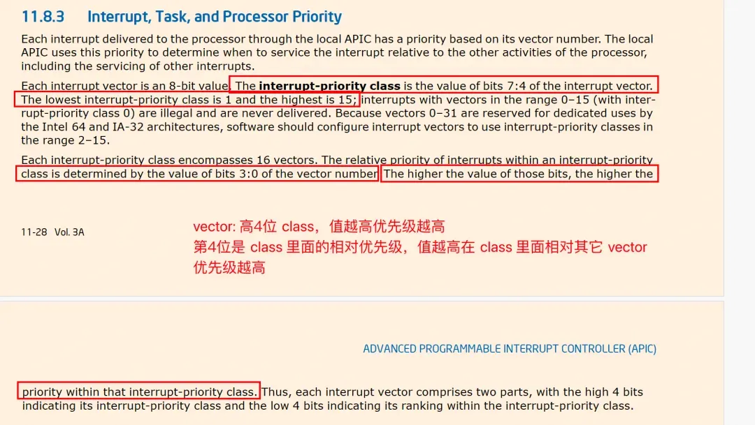 那是不是时钟中断的过程中就可以随意赋值,rsp 随意指向?答案依然是否定的。这里可以参考 intel 手册,对于中断优先级的解释如下,高优先级的中断是可以打断低优先级的中断。