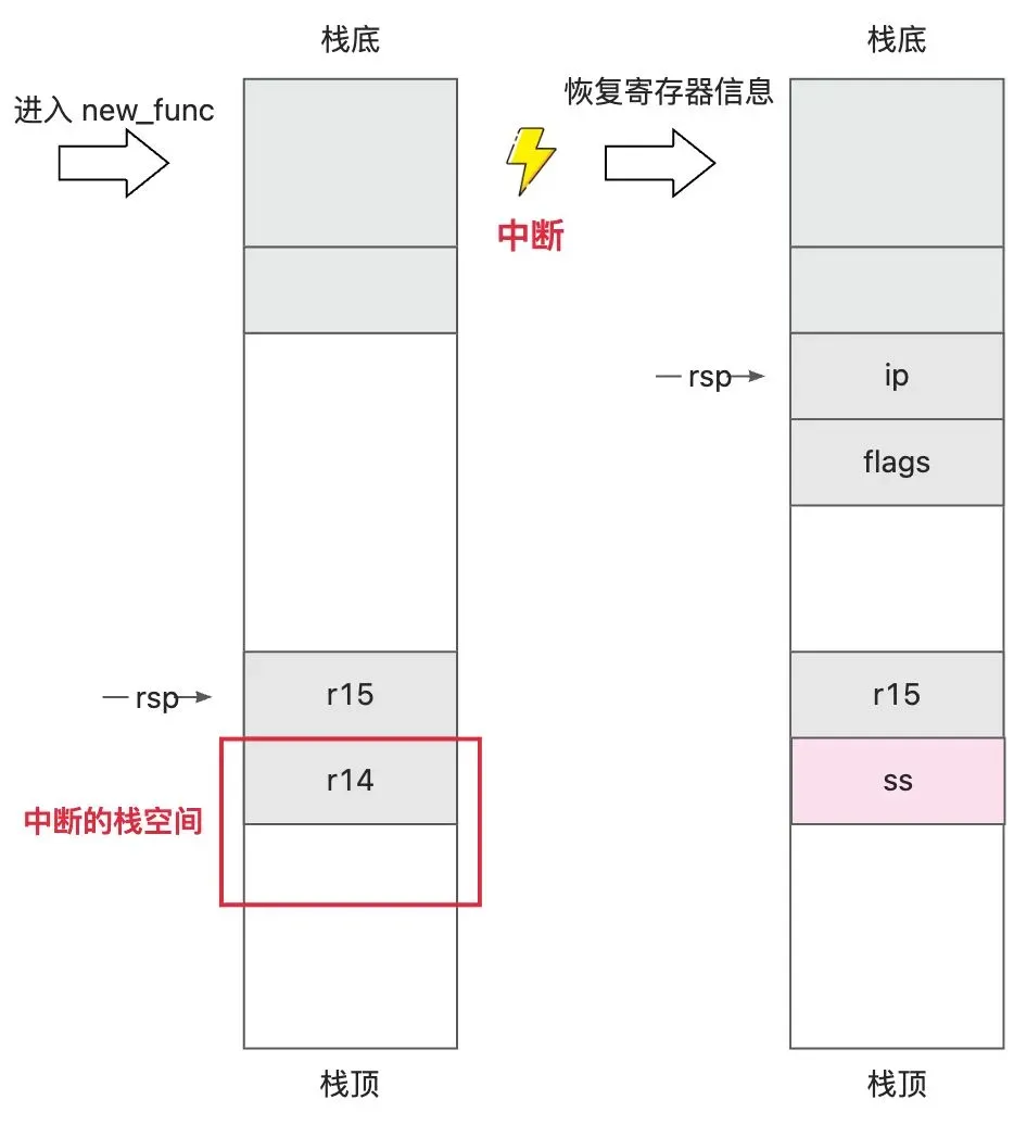 执行 new_func 函数,需要先保存此时的 r14、r15,也就是中断时 flags 寄存器和 rip 寄存器的值,接着将内核栈上的 r14、r15 从靠近栈顶的位置读出来,试想一下读 r14、r15 的时候如果 rsp 指向如下图所示: