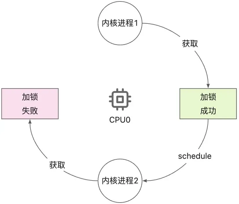 内核进程 1 绑定在 CPU0 上运行,且拿到一把锁,此时发生调度,CPU0 开始运行内核进程 2,就会一直夯在拿锁逻辑,内核进程 1 也永远不会再被调度。