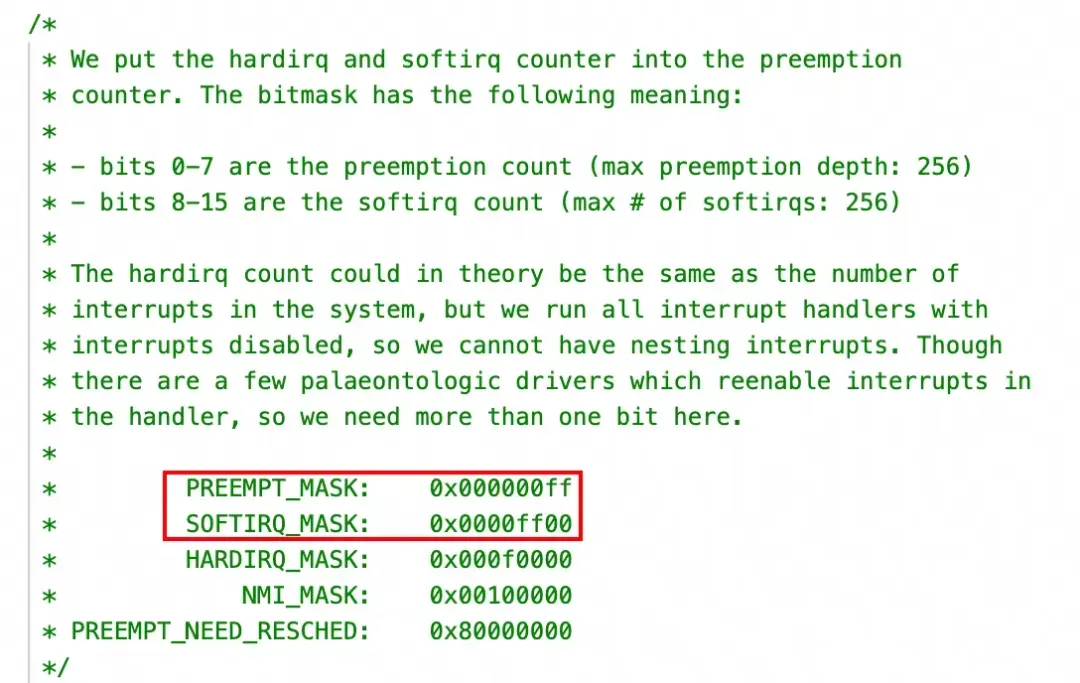 因为 preempt_cnt 为 0 的时候才允许被抢占,同时也不希望抢占处于软中断处理的情况,相关的 mask 信息如下: