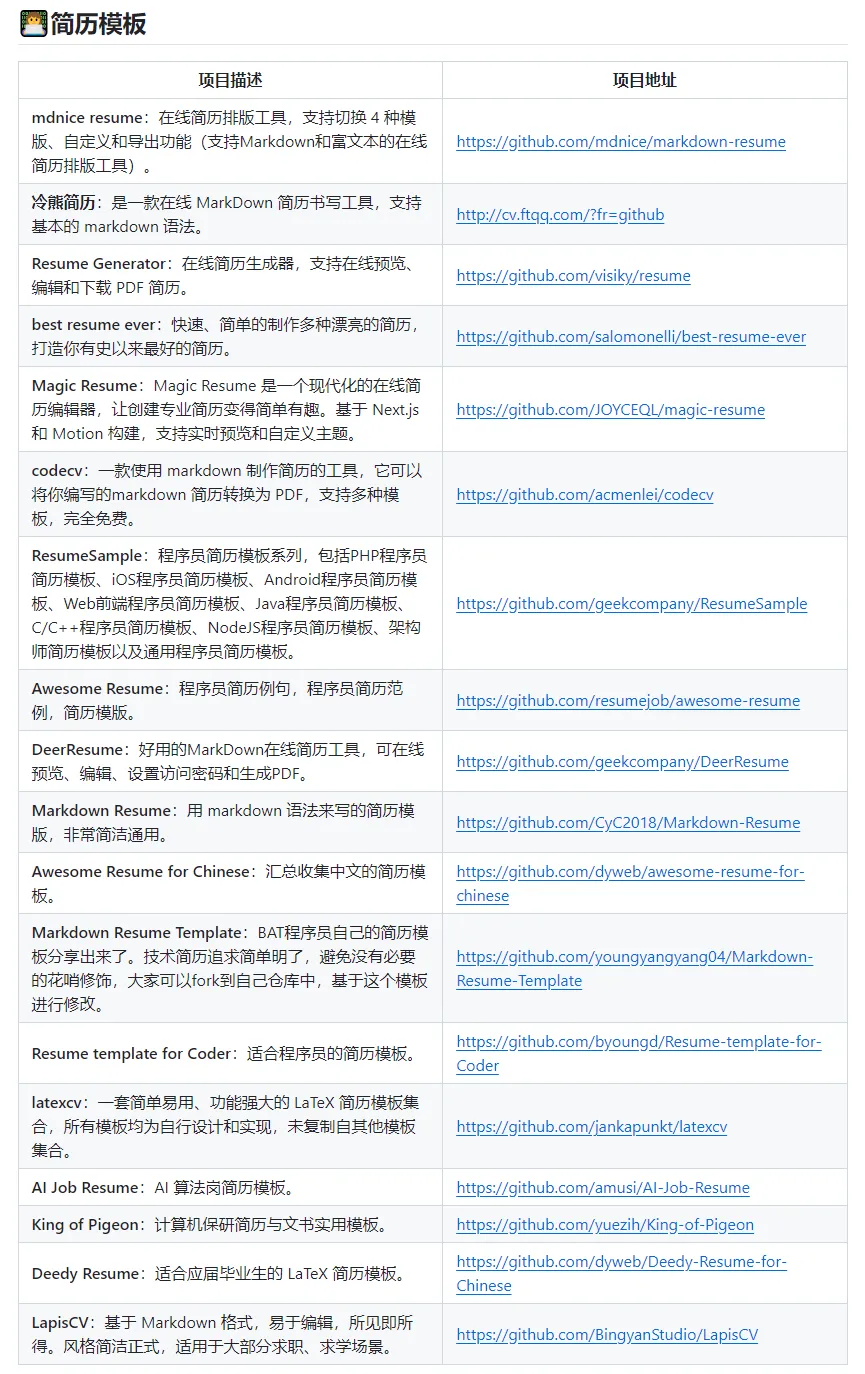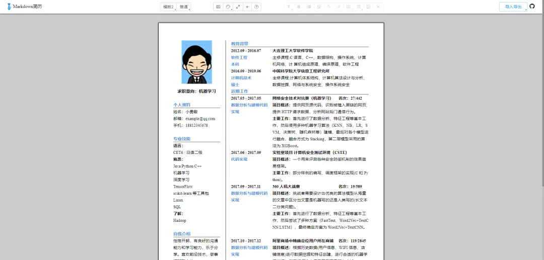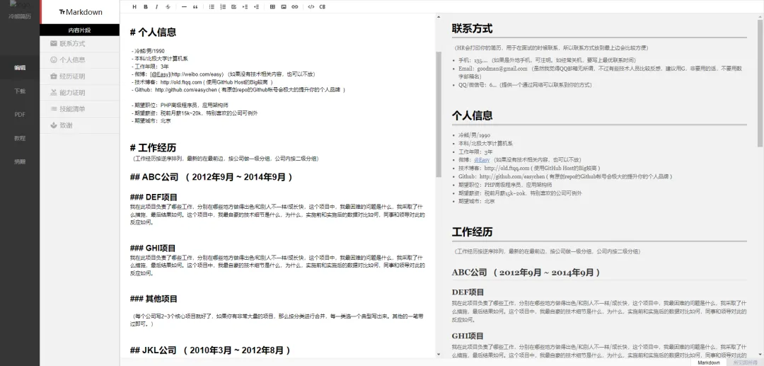 上面该注意的点和需要掌握的技能都已经提及了,接下来我们需要制作一份简洁明了的简历模板,个人比较推荐使用Markdown的简历模板,这样我们不需要考虑字体和字号问题,简历内容编写完成后导出PDF格式即可,这里我推荐几个免费的在线Markdown简历制作工具:
