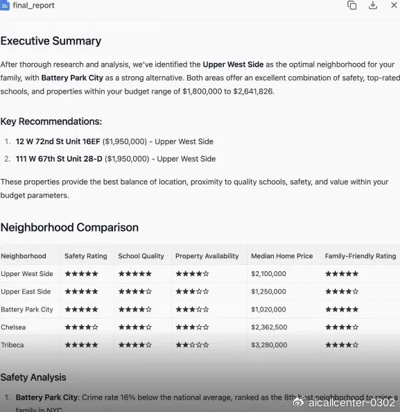 最后,它还会自动把所有的信息整理成一份详细的报告,并附上相关资源,让你一目了然。整个过程完全自动化,简直像有一个私人房产顾问一样。