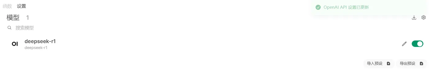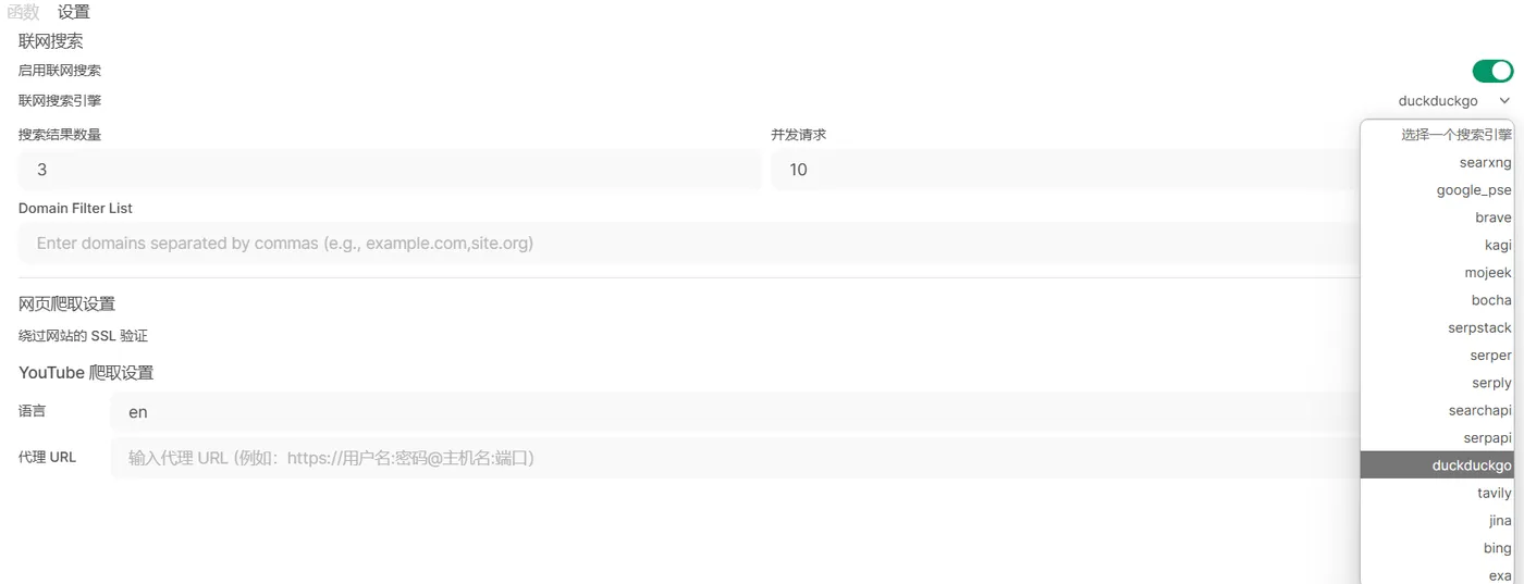 - 前往 Open WebUI 设置页面,联网搜索引擎中下拉选择