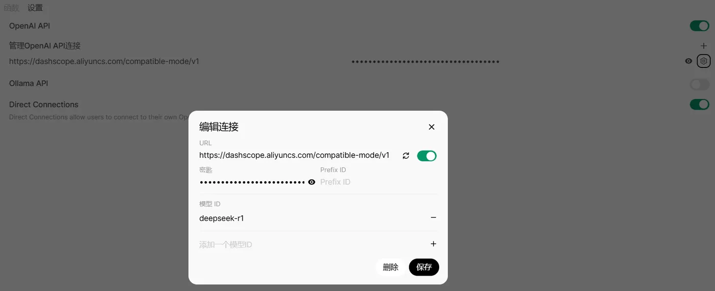 https://dashscope.aliyuncs.com/compatible-mode/v1,秘钥输入百炼获取的API KEY,模型 ID 输入deepseek-r1,记得一定要点输入框后面那个+加号,不然添加不进去。最后点击“保存”按钮。
