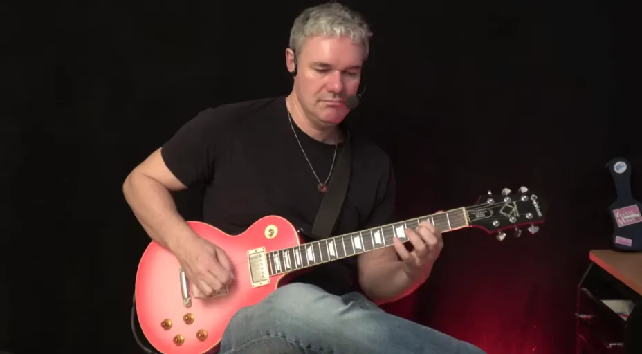 提示词:A man with short gray hair plays a red electric guitar.