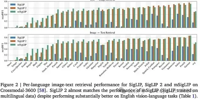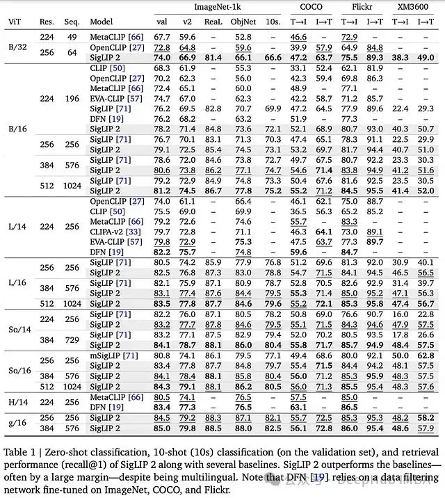 SigLIP 2 在零样本分类和图像-文本检索任务上表现优于 SigLIP 及其他开源基线模型,尽管同时支持多语言处理。模型显著提高了检索召回率,特别是对于通过蒸馏优化的小规格模型。
