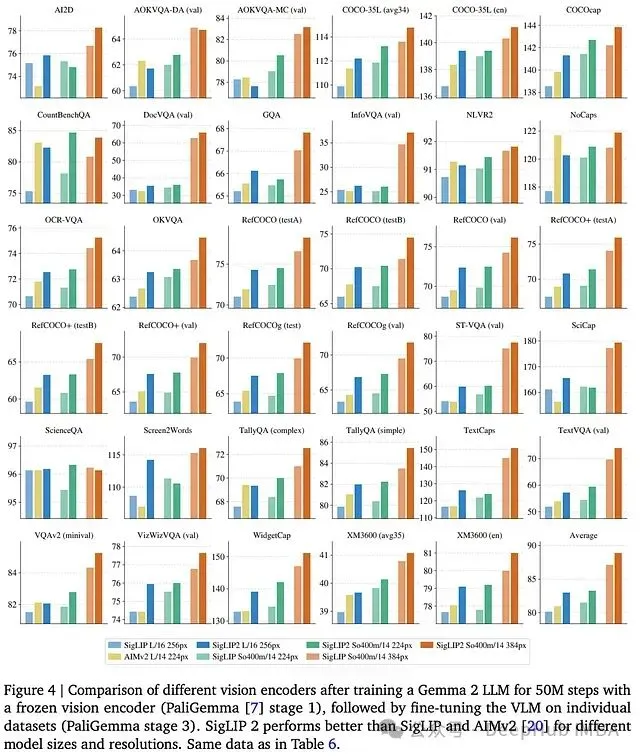 通过将 SigLIP 2 与 Gemma 2 2B LLM 集成并在 50M 多模态样本上训练,研究团队评估了 SigLIP 2 在 VLM 中的视觉表示提取能力。结果表明,SigLIP 2 在所有分辨率和模型规格上均优于原始 SigLIP。
