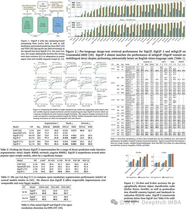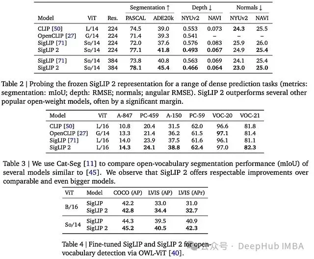 - 在开放词汇分割任务上,SigLIP 2 超越了 SigLIP 甚至规格更大的 OpenCLIP G/14 模型。