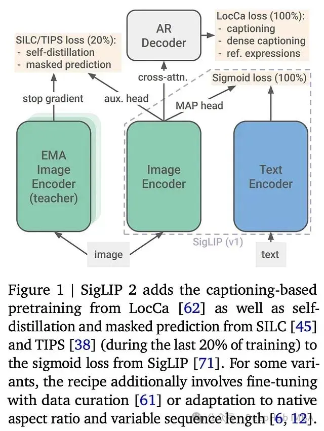 SigLIP 2 在预训练阶段结合了 SigLIP 和 LocCa 损失函数。与 CLIP 使用对比损失不同,SigLIP 将图像-文本匹配问题视为二元分类任务,通过逻辑回归方式训练嵌入表示。