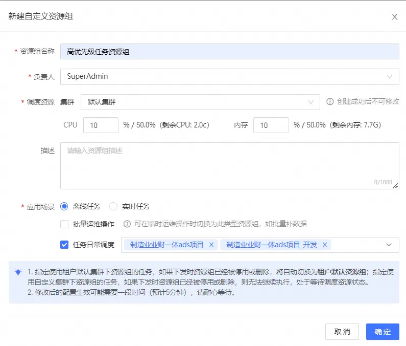 2、分配给该自定义资源组CPU和内存资源,并选择应用场景为离线任务-任务日常调度,需要配置可使用当前资源组的关联项目,配置后,在项目配置中,可选择关联的资源组作为项目默认资源组