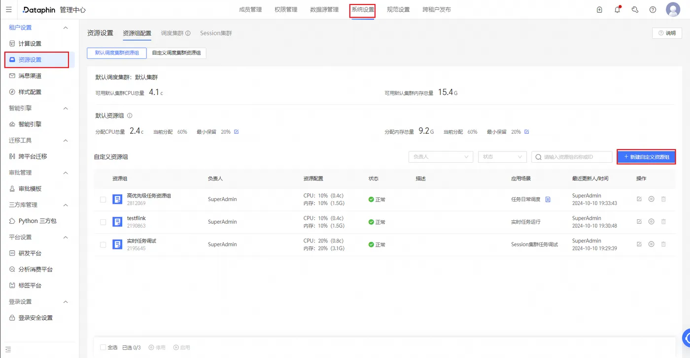 1、【系统设置-资源设置】可以在默认调度集群资源组中新建自定义资源组