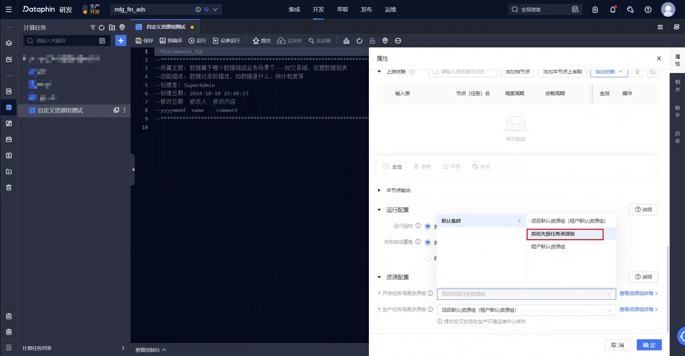 Dataphin提供了自定义资源组的功能,为高优先级任务分配一个单独的资源组,保证高峰期能够有足够的调度资源,任务及时产出