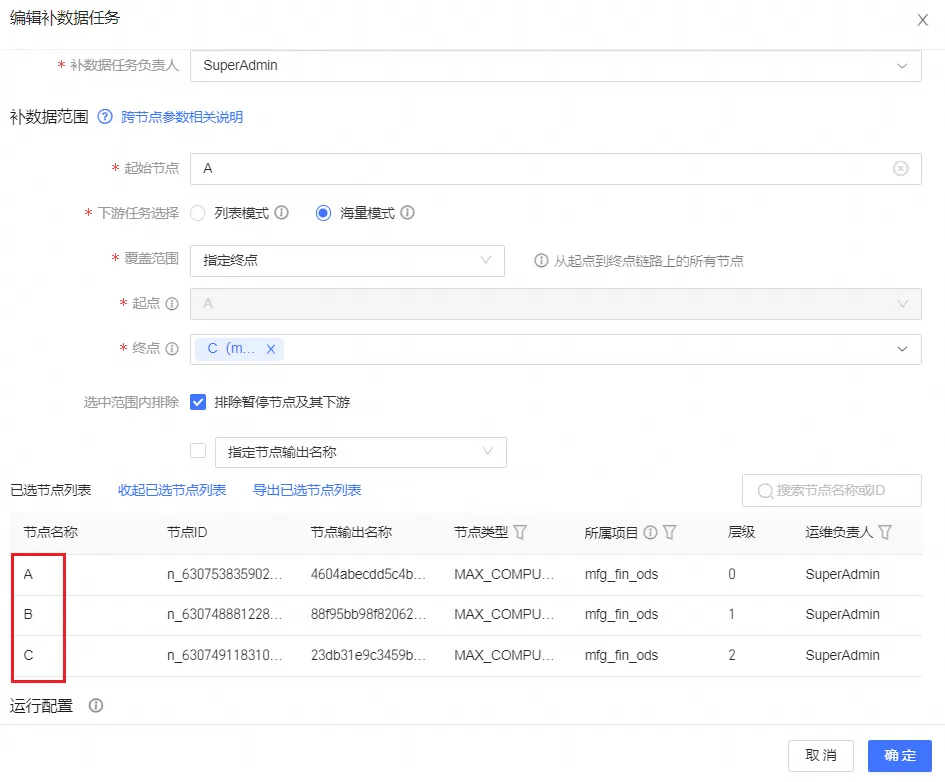 ②选择A任务作为起始节点,下游任务选择【海量模式】,覆盖范围【指定终点】,将终点指定为【C】,这样就可以指定起点到终点的方式,选择一整个链路中的所有节点,在已选节点列表中可以看到,当次补数据任务中会补A、B、C节点的数据