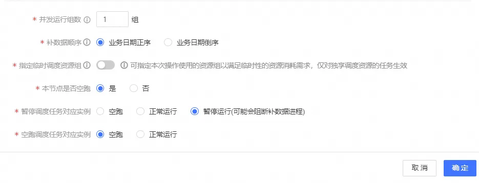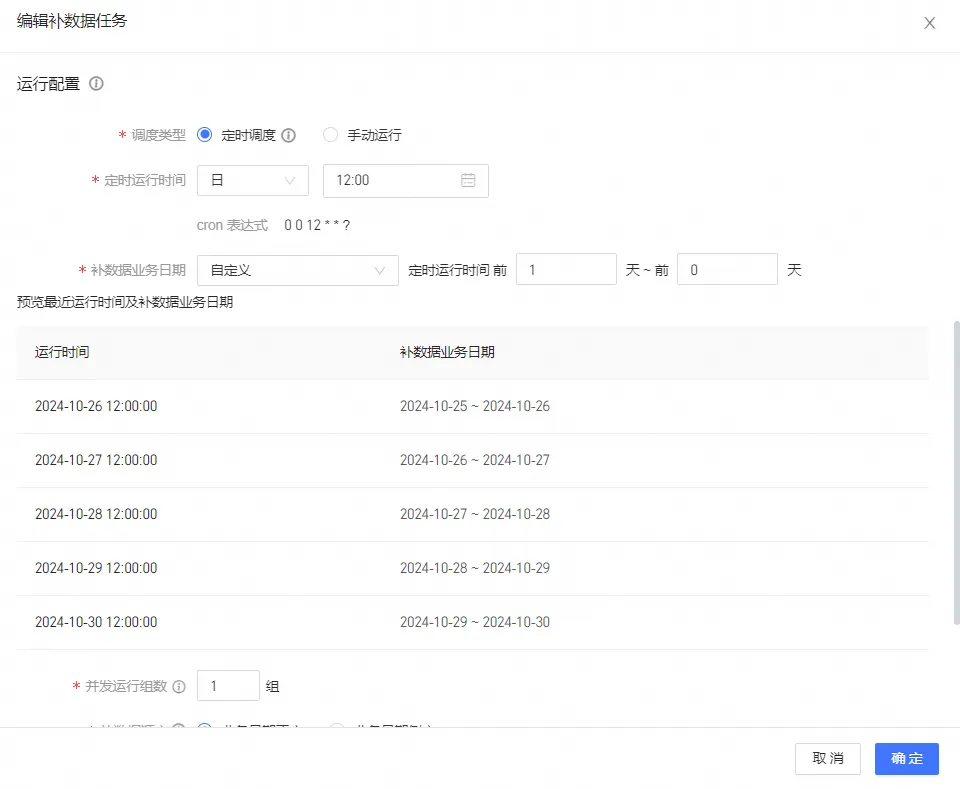 ③调度类型选择【定时调度】,定时运行时间选择【日;12:00】,补数据业务日期选择【自定义】定时运行时间前【1】~前【0】天,这样就会重新补上一个业务日期的数据