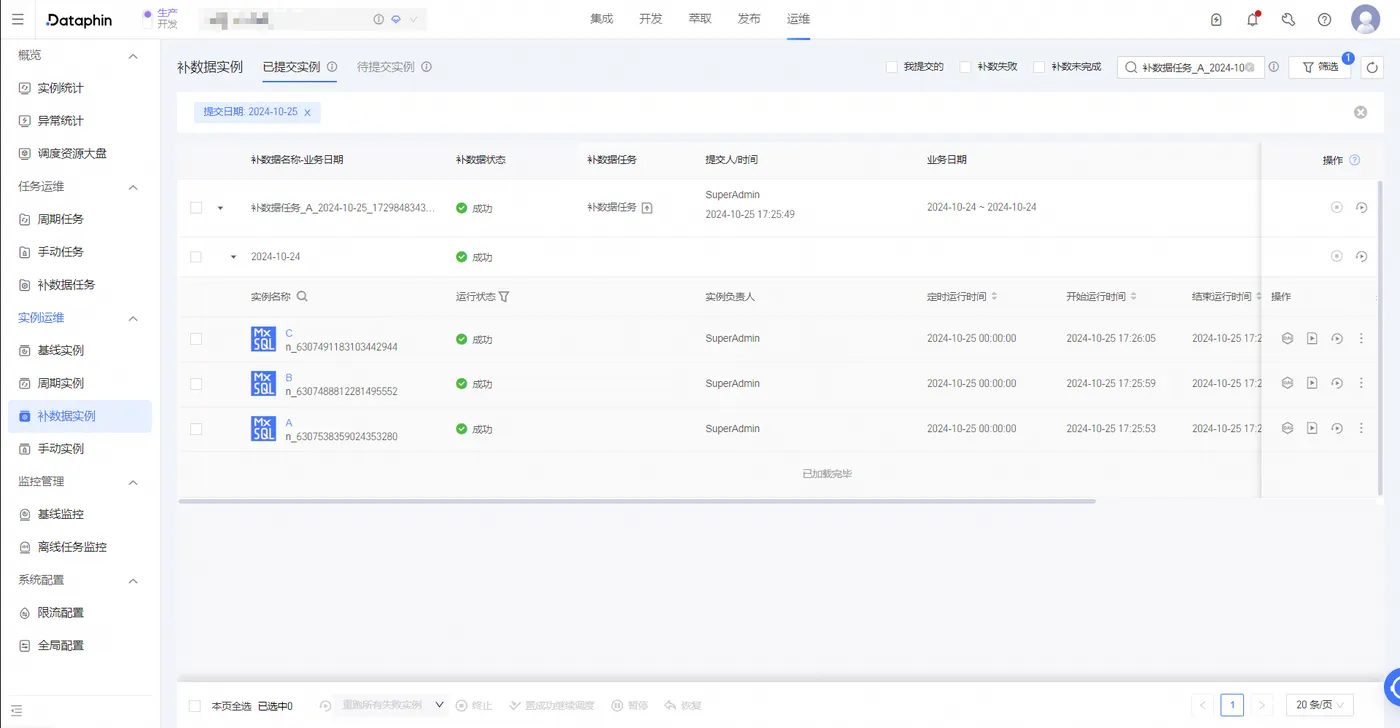 ⑤【补数据实例】页面可以看到这几个实例的补数据状态、开始运行时间、结束运行时间等