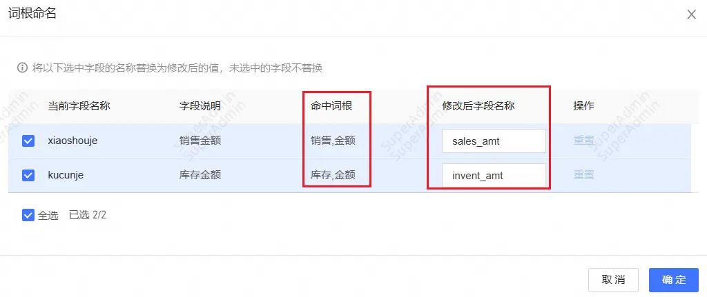 ③可以根据自己的需要,调整【修改后字段名称】,通过这种方式我们保证建表时不同字段都使用到同一关键词时的一致性,提高数仓的一致性和可读性