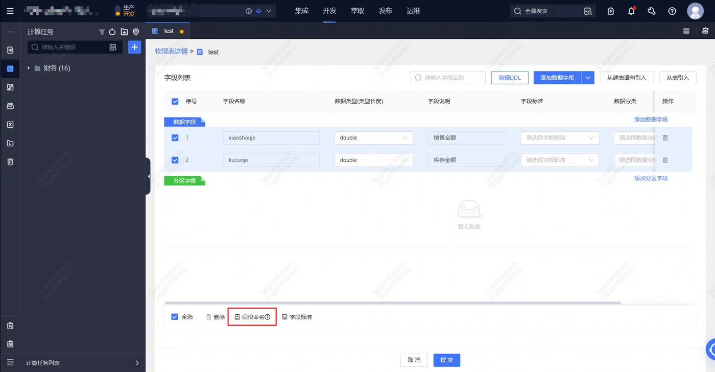 ②在新建物理表/逻辑表定义表结构时,可以点击【词根命名】,系统会根据已填写的“字段说明”自动分词并匹配已创建的词根名称,并基于词根缩写生成推荐的的自选名称