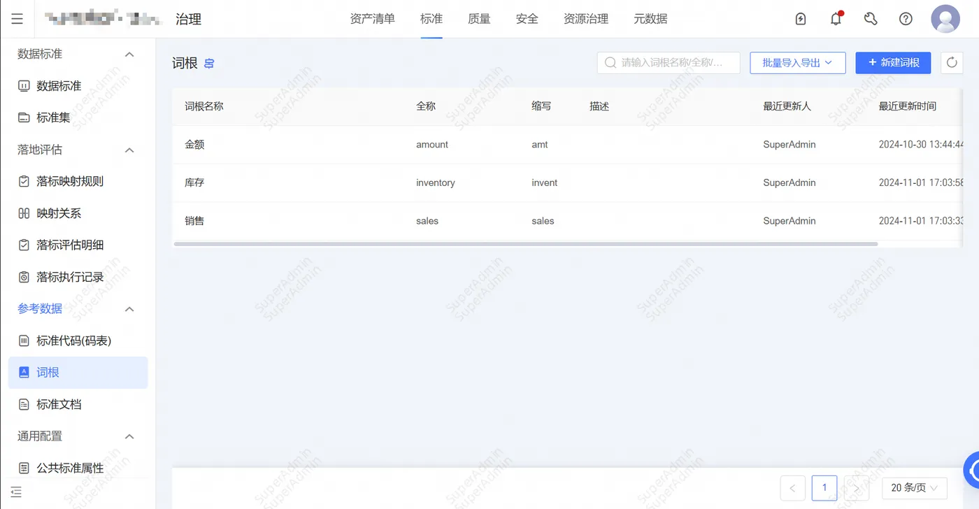 ①在【标准-词根】模块可以新建【金额、库存、销售】词根